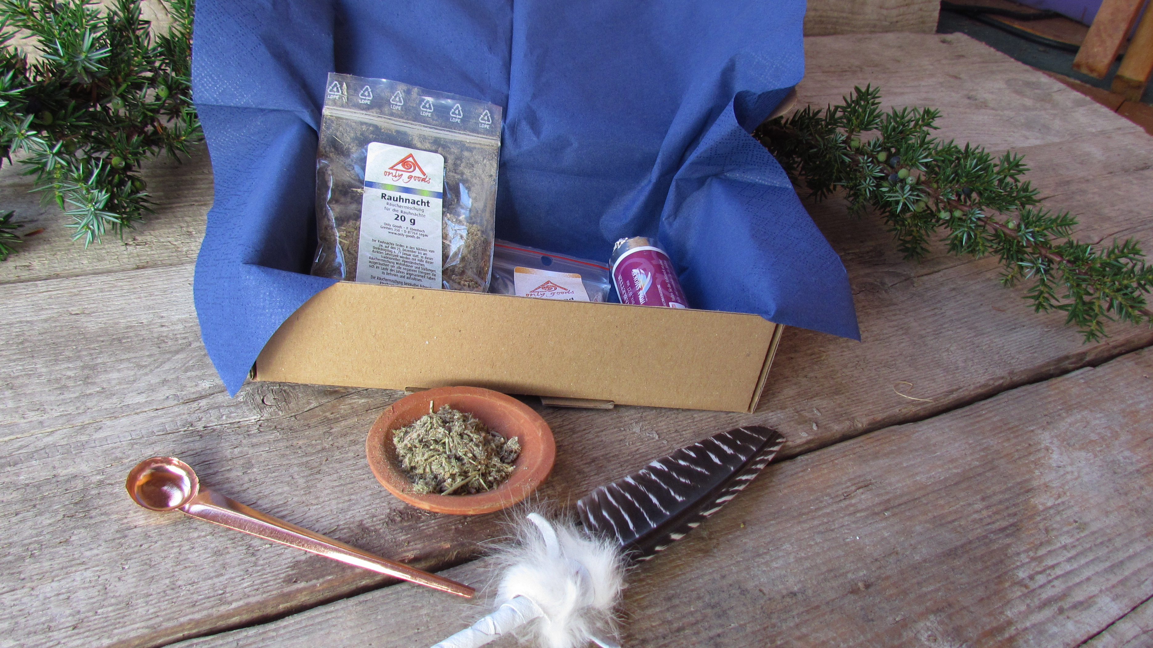1) 1 x Rauhnacht-Räuchermischung 20 g Beutel Die Räuchermischung beinhaltet folgende Räucherstoffe: Fichtennadeln, Douglasiennadeln, Wacholder, Salbei, Beifuß, Johanniskraut, Königskerzenblüten, Holunderholz (alle Pflanzen aus aus eigenem natur Anbau), Fichtenharz (Wildsammlung).